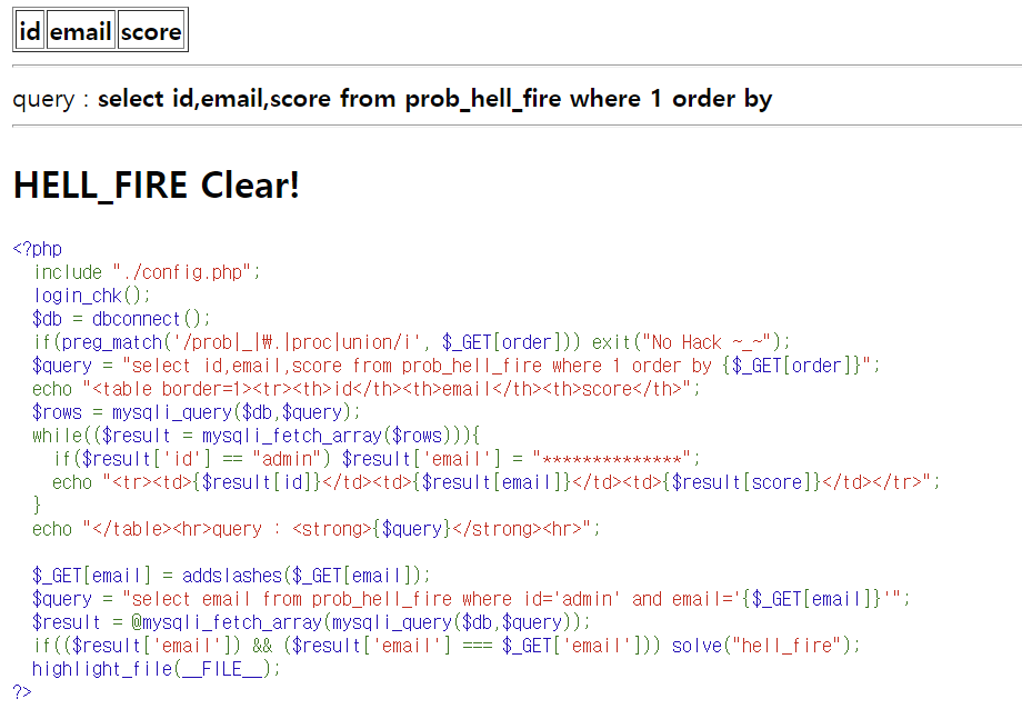 LOS (Lord of SQL injection) 문제 23번 hell_fire write-up 문제 23번 hell_fire query : select id,email,score from prob_hell_fire where 1 order by write-up/LOS write-up 2021.07.12