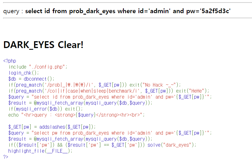 LOS (Lord of SQL injection) 문제 22번 dark_eyes write-up 문제 22번 - dark_eyes query : select id from prob_dark_eyes where id='admin' and pw='' write-up/LOS write-up 2021.07.12