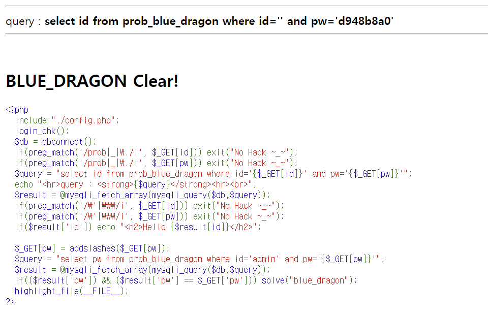 LOS (Lord of SQL injection) 문제 27번 blue_dragon write-up 문제 27번 - blue_dragon query : select id from prob_blue_dragon where id='' and pw='' write-up/LOS write-up 2021.07.13