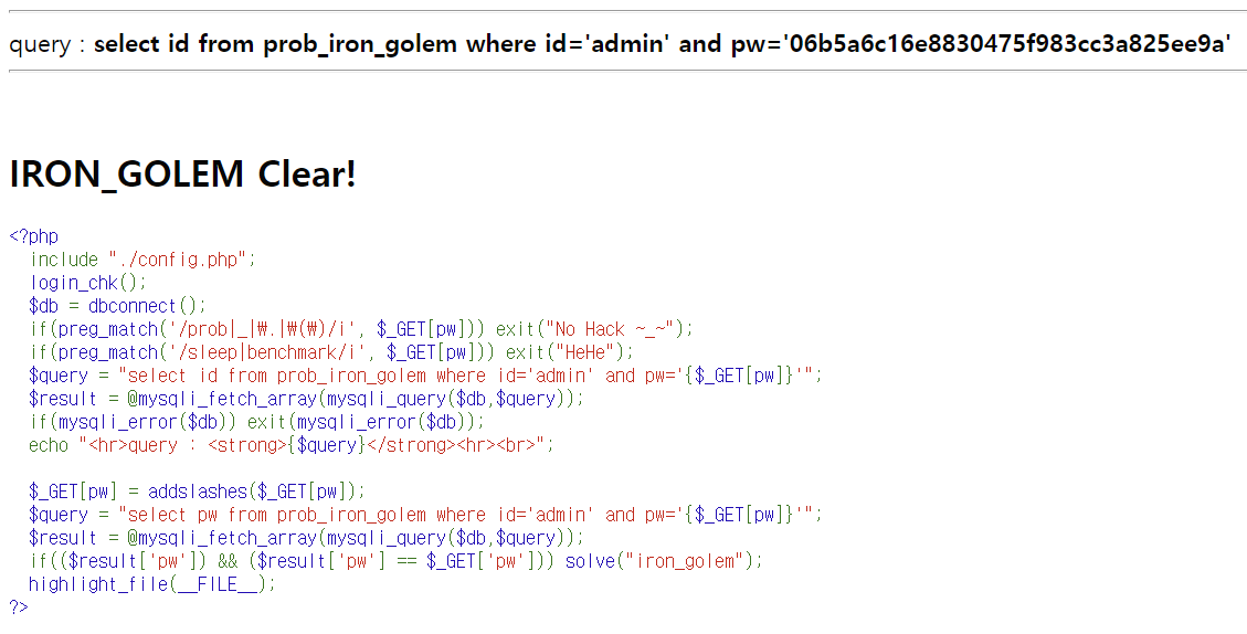 LOS (Lord of SQL injection) 문제 21번 iron_golem write-up 문제 21번 - iron_golem query : select id from prob_iron_golem where id='admin' and pw='' write-up/LOS write-up 2021.07.12
