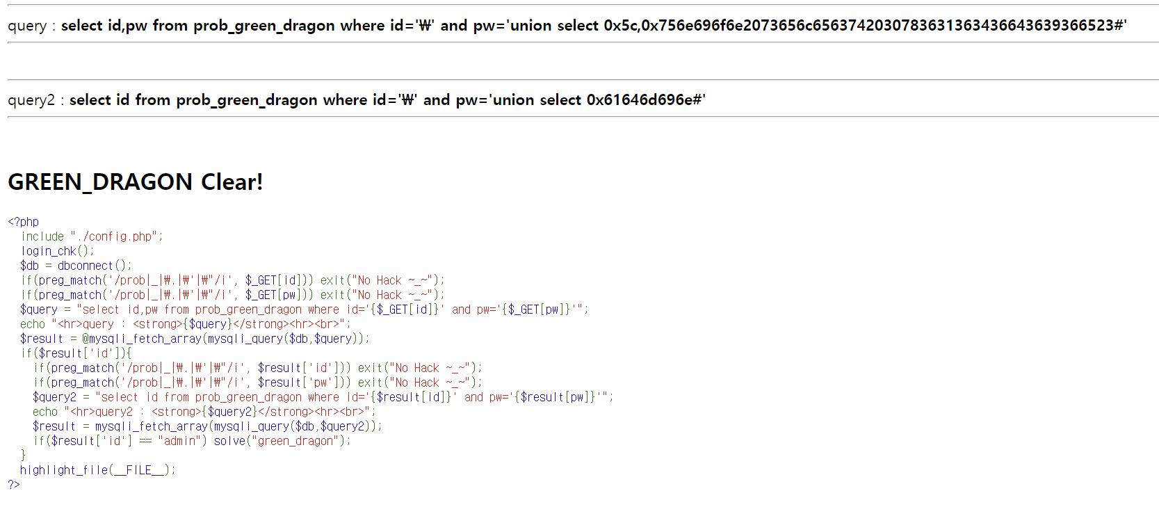 LOS (Lord of SQL injection) 문제 25번 green_dragon write-up 문제 25번 - green_dragon query : select id,pw from prob_green_dragon where id='' and pw='' write-up/LOS write-up 2021.07.12