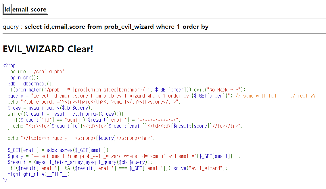 LOS (Lord of SQL injection) 문제 24번 evil_wizard write-up 문제 24번 - evil_wizard query : select id,email,score from prob_evil_wizard where 1 order by write-up/LOS write-up 2021.07.12
